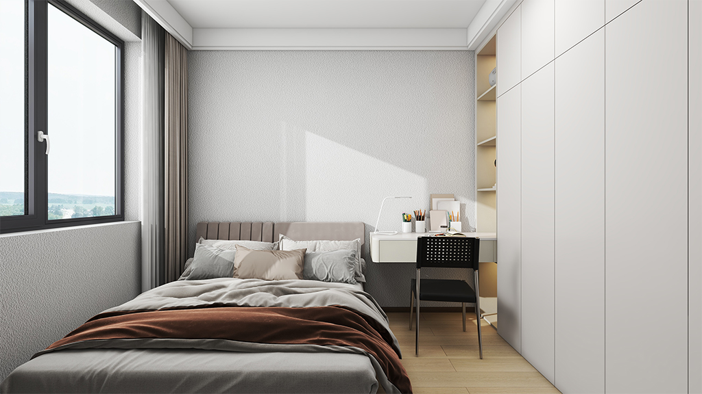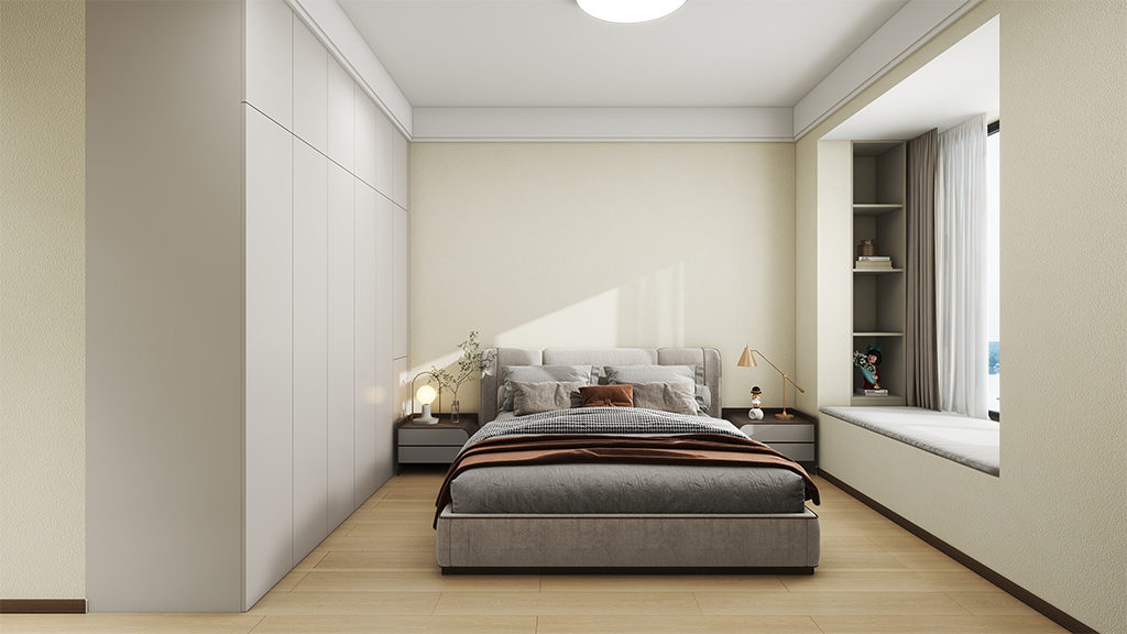 次卧采用的是奶白色的防潮固胶材料效果,配以简约的家具,营造出舒适愉悦的睡眠空间。
