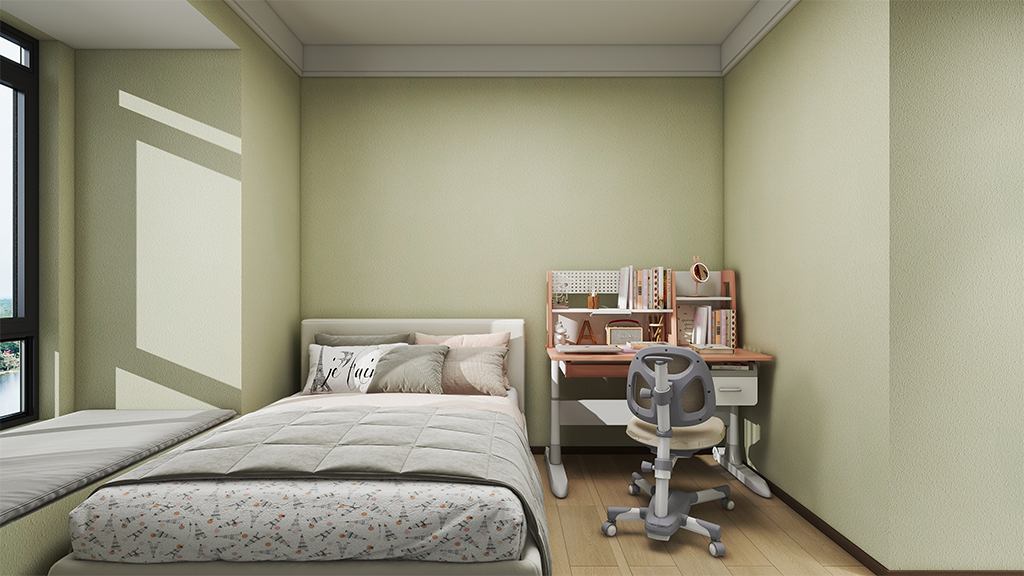 儿童房采用的是浅青色的防潮固胶漆材料效果,配以简约的书桌,营造轻松欢乐的成长环境。