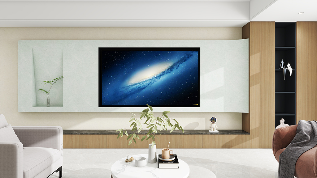 客厅电视墙采用奶油色的防潮固胶漆和米白色的微水泥材料效果,低调又不失高级的色系,配上简单的镂空电视柜,营造出了现代设计潮流的简约大气的家居风格。