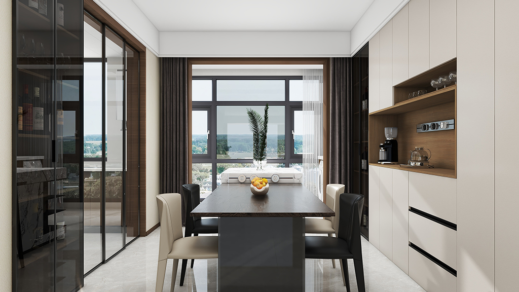 餐厅采用了奶白色的防潮固胶漆材料效果,整面落地窗配以白色定制的餐边柜,让空间更明亮,营造出轻松惬意的就餐环境。
