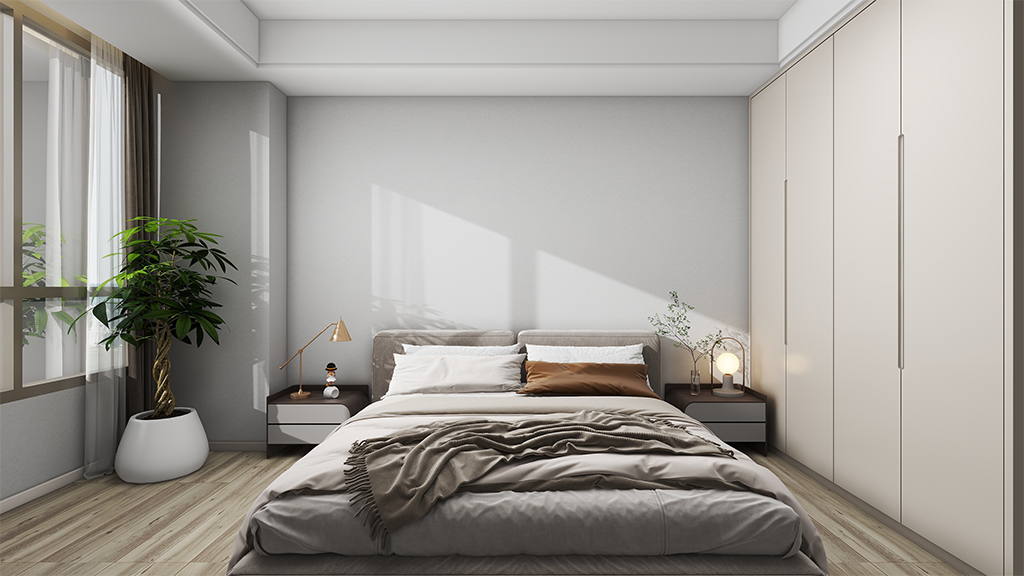 主卧采用了奶白色的防潮固胶材料的小拉毛效果,大窗户的设计,让室内的光线更加明亮柔和,配以简约的家具,营造出简约而又舒适的家居睡眠环境。