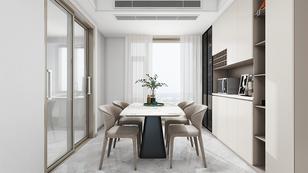 餐厅采用了奶白色的美陶石效果,配以合理空间布局,大空间收纳的餐边柜,让空间更有层次感,营造出轻松惬意的就餐环境。