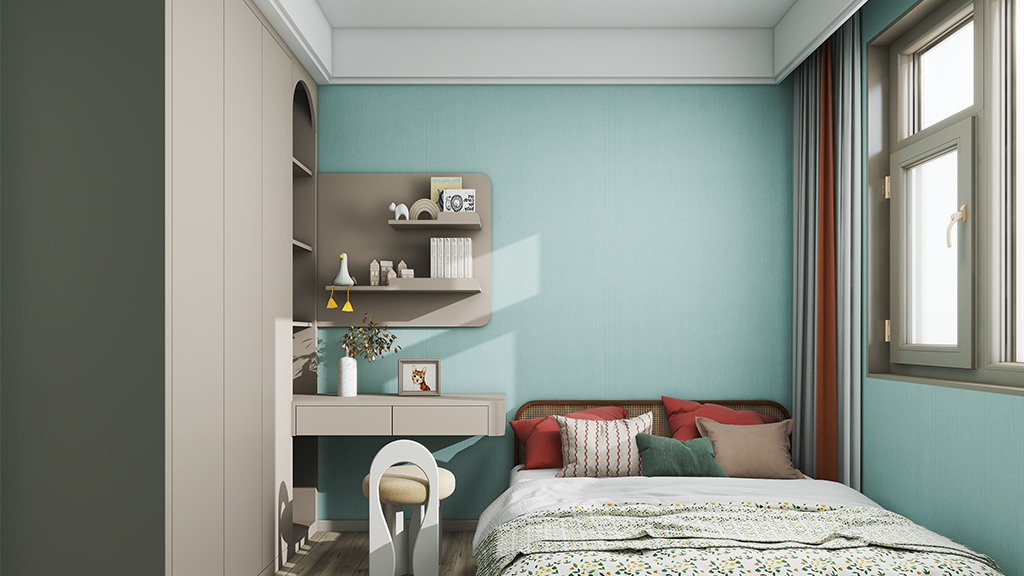女孩房采用了湖蓝色的珠光水漆材料效果,配以棕灰色的简约家具,营造轻松欢乐的成长环境。