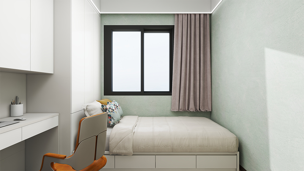 儿童房做的是奶白色的微水泥材料效果,配上简约的书桌,宽敞明亮的空间,营造出舒适的居家氛围感。