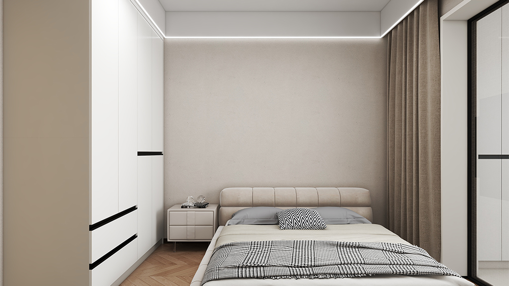 主卧采用了马卡龙色的微水泥材料效果,配以简约、实用的家具,让空间更加舒适、自然,营造出简洁、清爽、大气的私人空间。