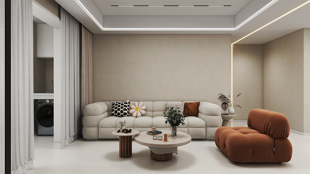 客厅采用了沙棕色的微水泥材料效果,配合上油奶色和焦糖色的棉花沙发,两者巧妙的结合,营造出一种简单而又温暖的居家环境。