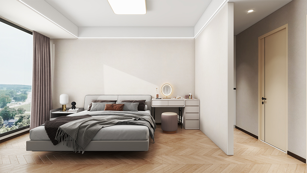 次卧采用了珊瑚粉的微水泥材料效果,柔和的色泽,加上大落地窗的明亮光线效果,营造出舒适宁静的居家氛围。
