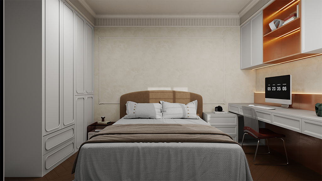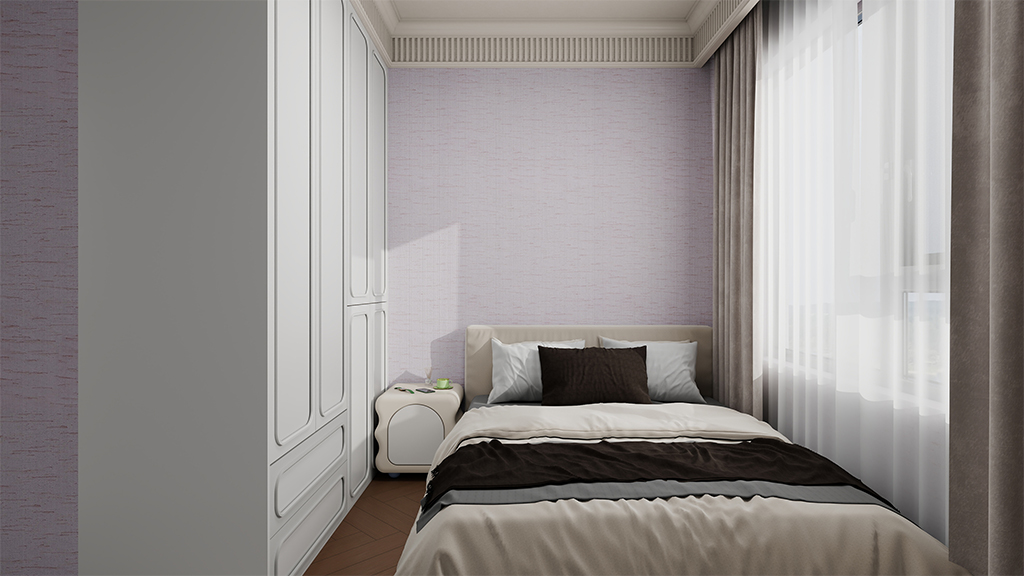 次卧采用了浅紫色的石桦卢材料效果,柔和的色泽,充分利用了合理的空间布局,营造出宁静安逸的居家氛围。