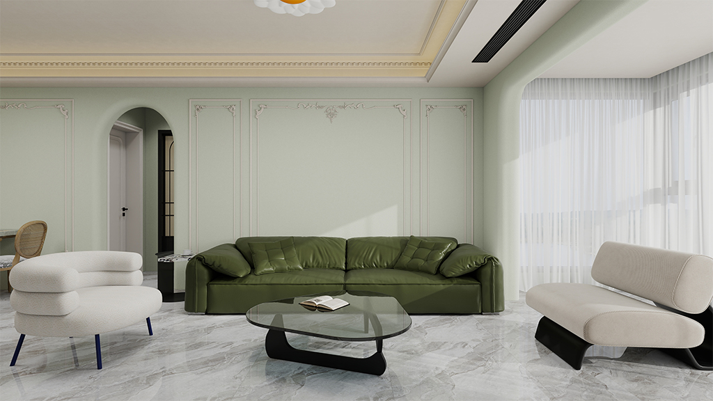 客厅采用了浅青色的蛋壳光材料效果,配合上深绿色的沙发,两者巧妙的结合,营造出一种简单而又温暖的居家环境。