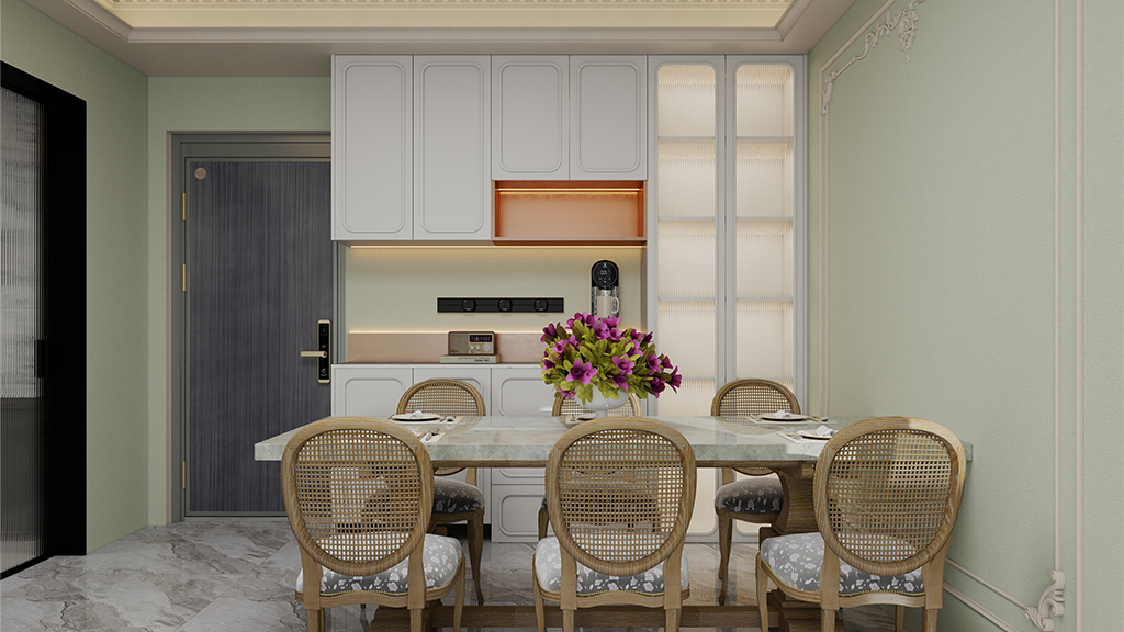 餐厅采用了浅青色的蛋壳光材料效果,加上花纹线条的装饰,让整个餐厅充满了艺术感,用餐的时候倍感愉悦。
