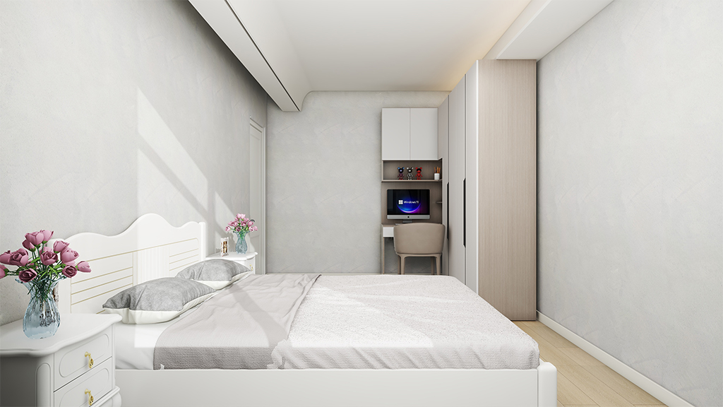 儿童房采用了奶白色的微水泥材料效果,配以简约的定制家具,让整个空间呈现出舒适明亮的家居氛围感。