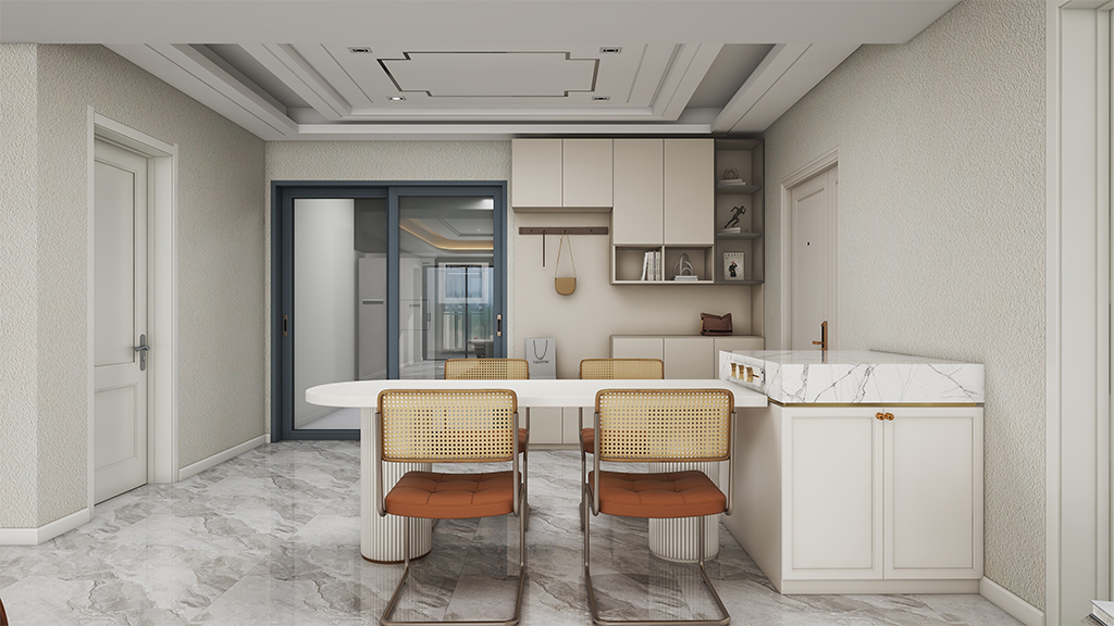 餐厅采用的是奶咖色的可可砂绒材料效果,配以合理空间布局,加上白色系列的餐桌家具,让空间更明亮,营造出轻松惬意的就餐环境。