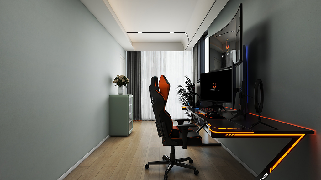 电竞房采用的是灰蓝色的美陶石材料效果,明亮的空间,简约的家具,营造出舒适愉悦的娱乐空间。