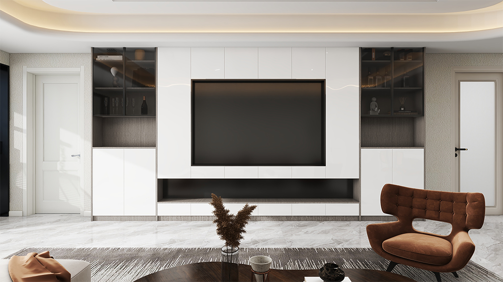 客厅电视墙做的是大收纳的定制电视柜,低调又不失高级的色系,营造出了现代设计潮流的简约大气的家居风格。