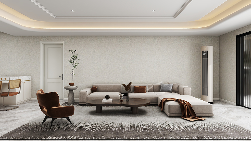 客厅采用了奶咖色的可可砂绒材料效果,配以浅灰色系的简约家具,营造出一个开放、简洁的居住环境,让人身处其中,可以全身心放松,消除一天的疲劳感。