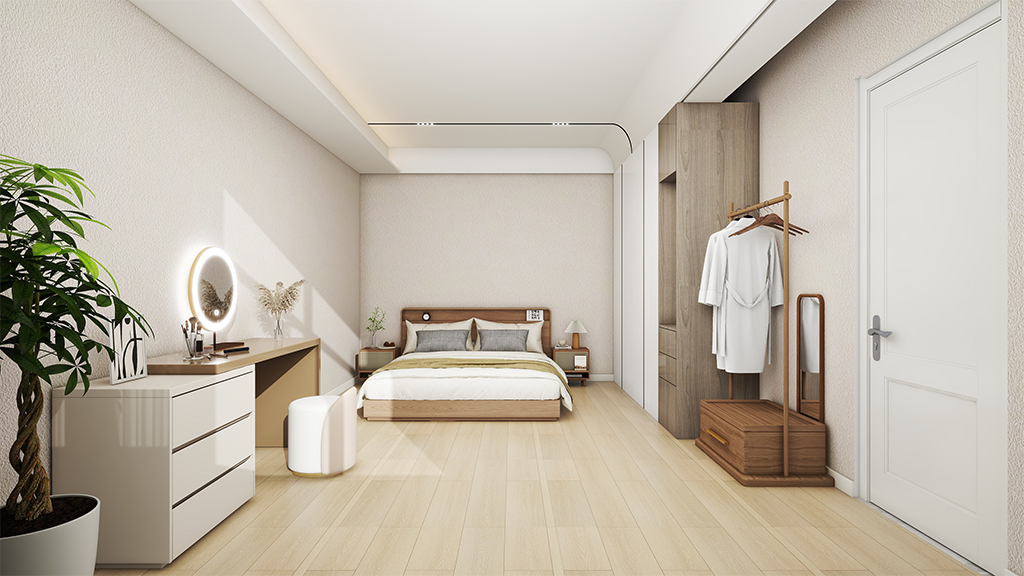 主卧采用了浅马卡龙色的可可砂绒材料效果,配以简约的家具,营造出简约而又舒适的家居睡眠环境。