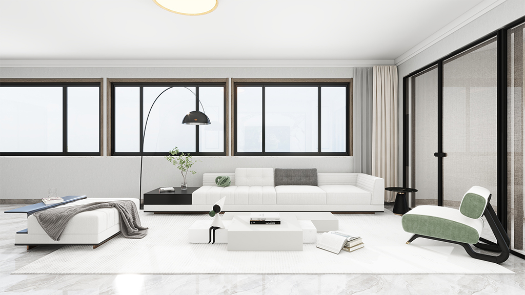 客厅采用了菱花白的微水泥材料效果,配以白色的简约家具,营造出一个开放、简洁的居住环境,让人身处其中,可以全身心放松,消除一天的疲劳感。