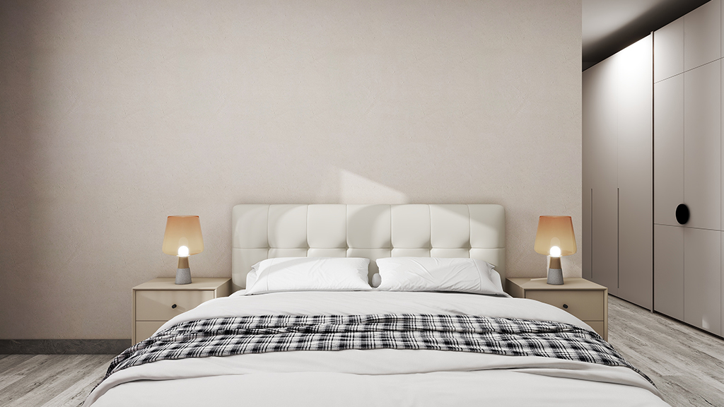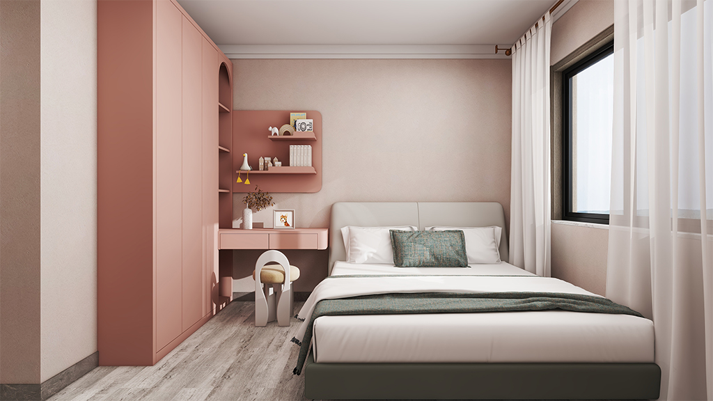 主卧采用了珊瑚粉的微水泥材料效果,配以简约大方的白色家具,营造出简约而又舒适的家居睡眠环境。