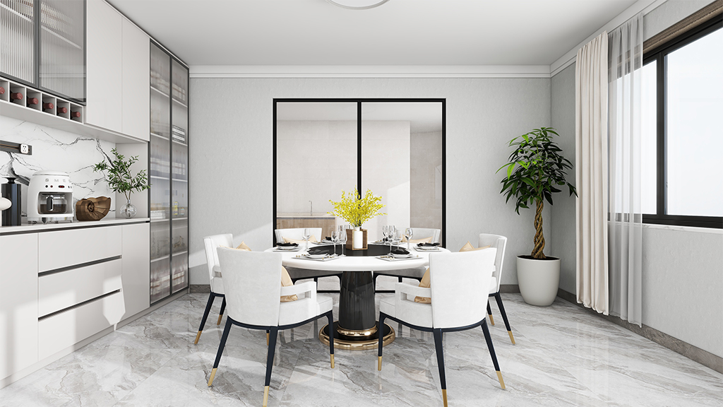 餐厅采用了菱花白的微水泥材料效果,配以简约的餐桌和大收纳设计的餐边柜,营造出轻松惬意的就餐环境。