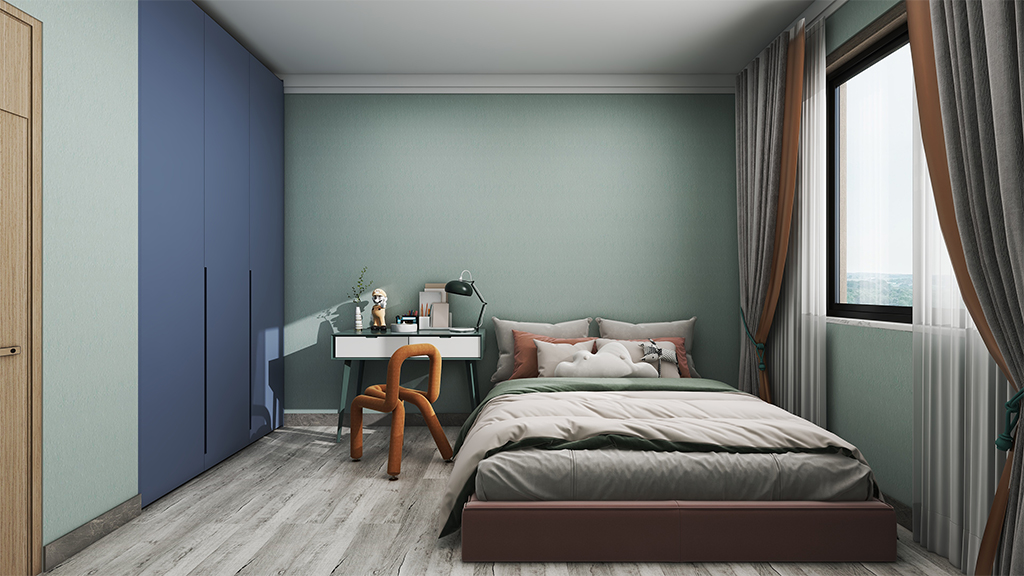 次卧采用了青绿色的微水泥材料效果,配以简约的家具,营造宁静舒适的休息环境。