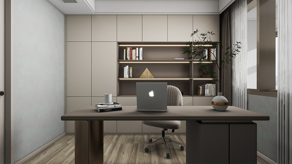 书房采用了浅灰色的珠光水漆材料效果,配以简约书柜和书桌,营造宁静的办公环境。