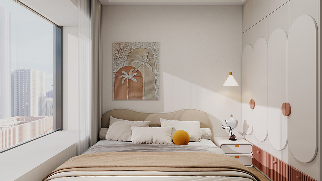 儿童房采用浅马卡龙颜色的微水泥材料效果,配搭同色系的订制柜子互相呼应,营造舒适明亮的家居环境。