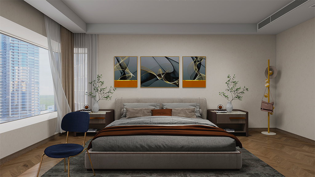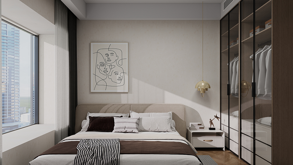 主卧采用的是奶白色的微水泥材料效果,搭配简约时尚轻奢软装,很好的凸显出主人房的气质,低调且不失高雅。
