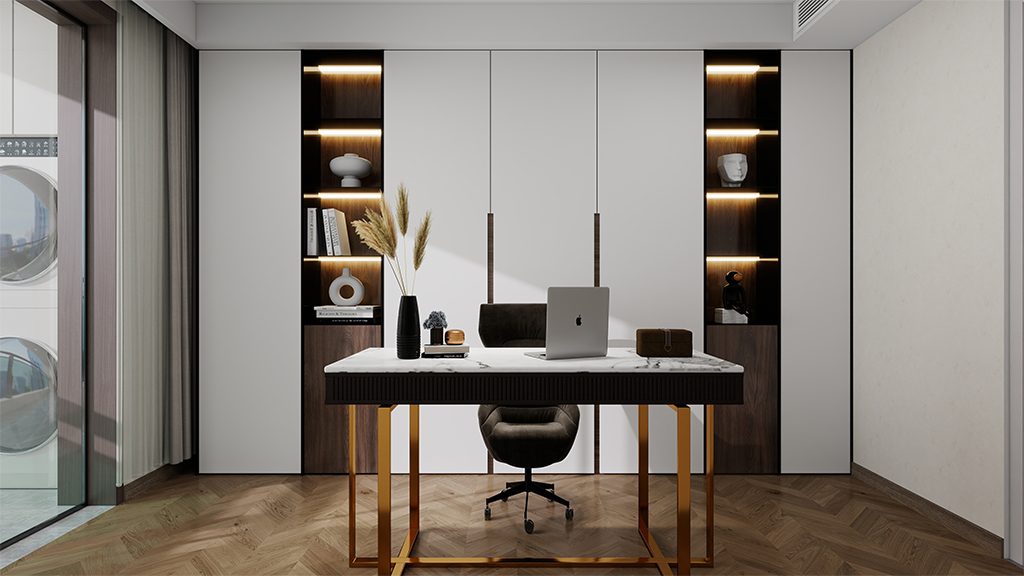 书房采用的是浅黄色的微水泥材料效果,配搭白色的定制书柜,明亮而又实用的空间感,让人在这里工作可以感觉到无限的宁静。