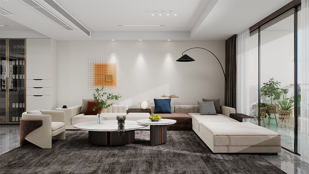 客厅采用的是乳窑色的微水泥材料效果,搭配现代风格的软装及质感的家具,给人以简约大方的空间美感,展现出极致的简约轻奢的现代风格。