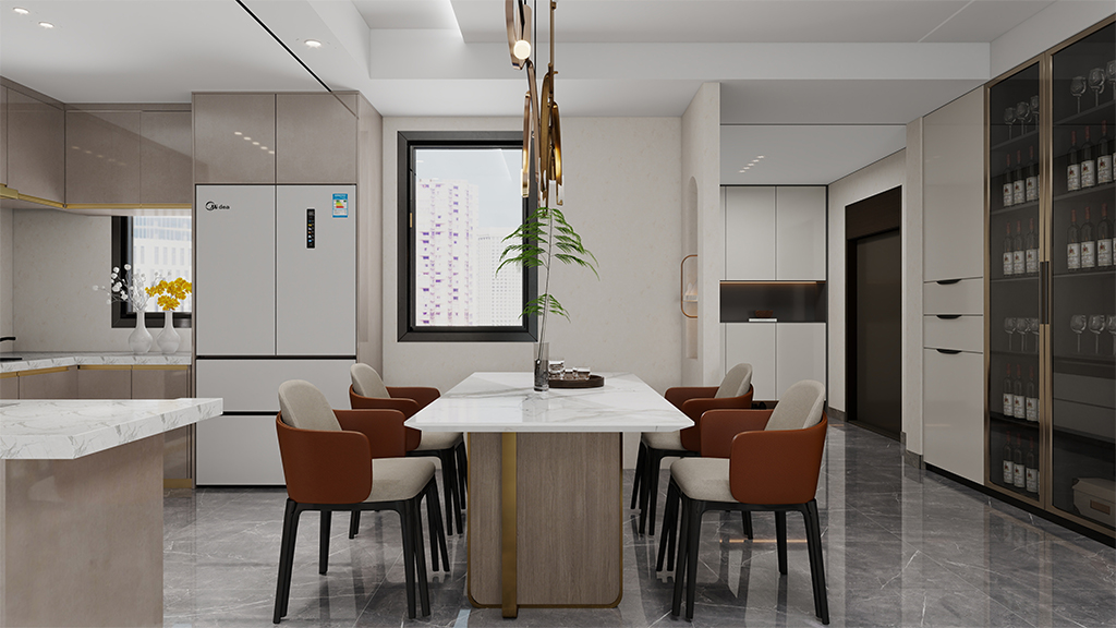 餐厅采用和客户一样的乳窑色微水泥材料效果,时尚的餐桌及摆设品,简约而不简单,营造轻松惬意的就餐环境。