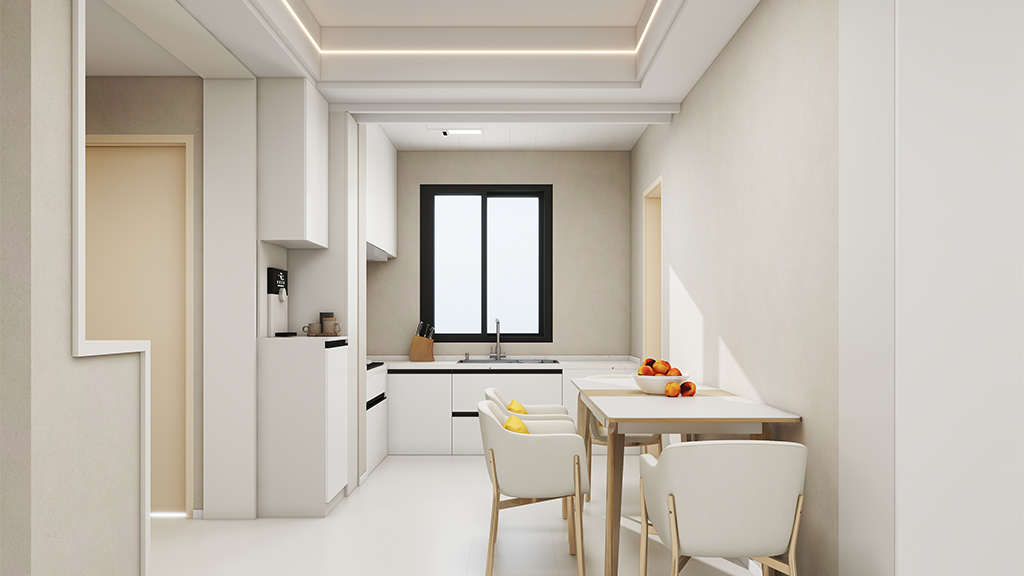 餐厅采用了奶白色的微水泥材料效果,配以开放式的厨房和简约餐桌,让整个餐厅明亮舒适,时尚而又简洁,用餐的时候倍感愉悦。